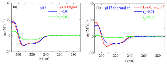 CD spectra from the lysozyme (red) and complexes with rm = 0.01 (blue) and rm = 0.03 (green) (a) without and (b) with thermal treatment at pH 7.