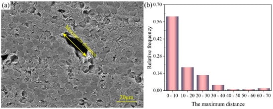 In UD C/C composites, the fiber size and distribution are the same in the cross-section perpendicular to the fiber axis. According to the previous study [30], the pore is elongated and parallel to the fiber axis. Thus, this paper uses the 2D RVE model based on the assumption that the pore structure is almost the same in the cross-section perpendicular to the fiber axis. Figure 2a gives the microstructure of UD C/C composites, where the maximum distance is the distance between the farthest two points. It is observed in Figure 2b that the maximum distance in pore morphology is mainly within the range of 30 μm using the image-processing technology. Meanwhile, the average maximum distance is 12.32 μm by measurement. Therefore, the pores with the maximum distance of below 30 μm are considered.