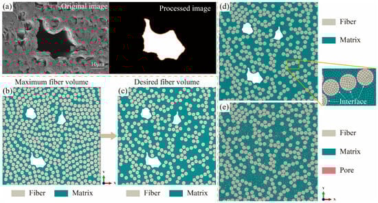 (a) The original SEM image and image-processed pore profile. The RVE models with (b) the maximum fiber volume fraction and (c) the desired fiber volume fraction based on the modified random fiber removal algorithm. Meshed models with (d) irregular pores and (e) elementary pores, where the subgraph presents interfacial regions between the fiber and matrix.