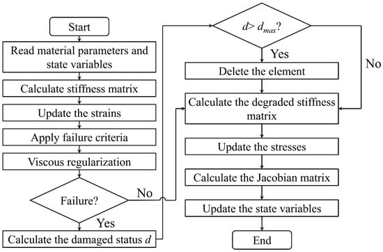 The above calculation of the damage initiation and evolution of the matrix is completed using the user subroutine UMAT. The specific flow is presented in Figure 4.