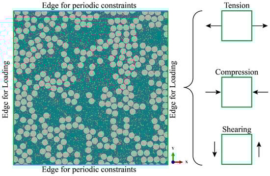 This paper focuses on transverse tension, compression, and shearing. Therefore, the load is imposed on the two edges along the x direction while the other two edges are constrained by the periodical boundary condition, as shown in Figure 5. For the periodical boundary condition, the equations of limiting the freedom are obtained by [20]: