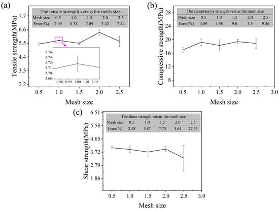 Effects of the mesh size on the (a) tensile strength, (b) compressive strength, and (c) shear strength of UD C/C composites.