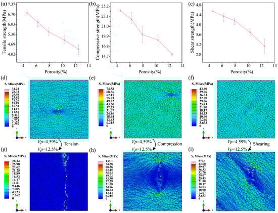 Effects of porosities on (a) the tensile, (b) compressive, and (c) shear strength of UD C/C composites. Stress contours of (d,g) the tension, (e,h) compression, and (f,i) shearing when the porosity is 4.59% and 12.5%, respectively.