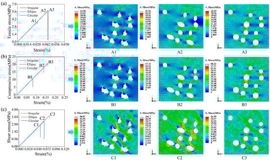 The stress–strain curve and corresponding contours of RVE models with irregular, ellipse, and circular pores under (a) tensile, (b) compressive, and (c) shear loading.