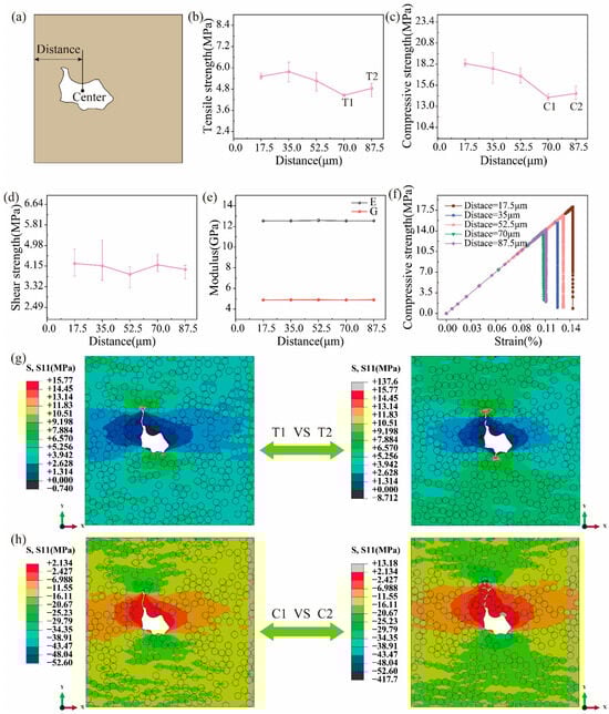 (a) Definition of the pore location and effects of the pore location on (b) the tensile, (c) compressive, and (d) shear strength. (e) The tensile and shear moduli versus the pore location. (f) The stress–strain curve for compression. (g) The tensile and (h) compressive stress contours at the max strength for the distance of 70 μm and 87.5 μm.