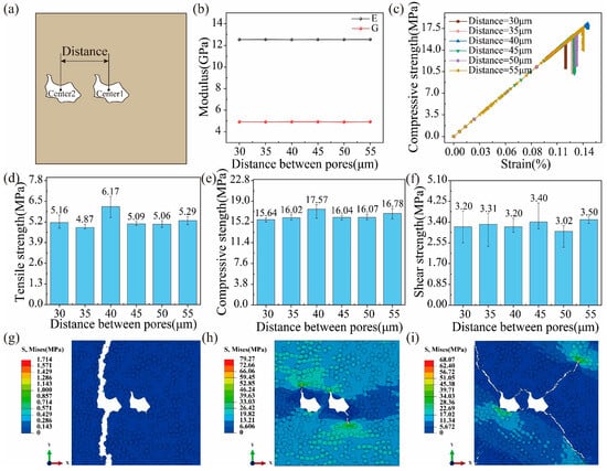 (a) Definition of the distance between two pores. (b) The tensile and shear moduli versus the pore location. (c) Stress–strain curves for compression. Effects of the pore location on (d) the tensile, (e) compressive, and (f) shear strength. Final stress contours of (g) tension, (h) compression, and (i) shearing when the distance is 40 μm.