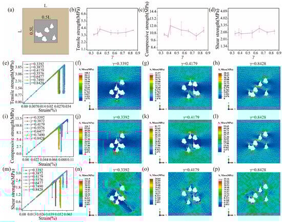 (a) Definition of the pore clustering and effects of the pore location on (b) the tensile, (c) compressive, and (d) shear strength. The stress–strain curve for (e) tension, (i) compression, and (m) shearing. Stress contours for (f–h) tension, (j–l) compression, and (n–p) shearing at the peak strength.
