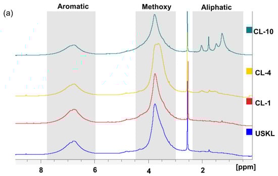 Figure 2a shows the 1H NMR spectra of the lignin derivatives. The methoxy (-OCH3) and aromatic groups are represented by wide signal peaks in the ranges of 3.0 to 4.5 ppm and 6.0 to 7.8 ppm, respectively [13,33]. Notably, the presence of the DMSO-d6 solvent generated a peak at 2.50 ppm [34]. Following the carboxyalkylation procedure, distinct new peaks in the aliphatic region in the range of 0.5–2.4 ppm became noticeable, indicating the presence of protons from the grafted alkyl chains. This demonstrates the incorporation of alkyl side chains with carbon numbers of 1, 4, and 10 into the lignin framework for CL-1, CL-4, and CL-10, respectively. Based on the overall results obtained from the 1H NMR analysis, it can be concluded that the grafting reactions involving all three types of reagents were successfully executed to enhance both their water solubility and amphiphilic properties [16].
