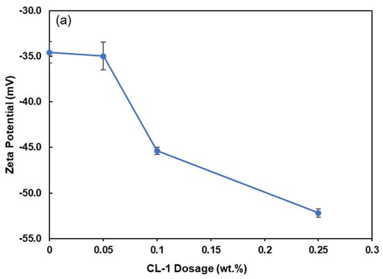 Understanding the zeta potential of coal particles in coal water suspensions is crucial for revealing the interaction mechanism between the dispersant and coal particles. Factors such as coal properties, dispersant type, and anionic ions in the solution influence the zeta potential of suspensions [42]. Figure 5 depicts the zeta potential of the coal suspension in the presence of CL-1, while coal loading was maintained at 50%. In the absence of the dispersant, the zeta potential of coal particles was measured at −34.6 mV, implying that the original coal particles carried a negative charge [43]. In the presence of CL-1, the zeta potential dropped to −52 mV, which is attributed to the attachment of CL-1 and lignin’s carboxylic acid group developing more anionic charge groups on the coal surface [39]. Therefore, the improved stability of coal particles can be attributed to electrostatic repulsion mechanisms that were raised as a result of lignin adsorption onto the particle surfaces [10].
