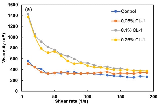 For CWS to be an effective fuel, it should have a high coal content for addressing the energy demand and high stability and long shelf life for its long-term storage, long-distance transportation, and the processing of the slurry (e.g., mixing, pouring, and general handling) [57,58]. CWS with good stability often has a ‘shear thinning’ behavior, which keeps a high viscosity in a static state and a low viscosity during transportation [57]. Compared to the control sample, the addition of CL dispersant enhanced the shear thinning behavior of CWS by increasing viscosity in a static state (at a shear rate of 0) and reducing viscosity at higher shear rates (Figure 7), indicating the desirable rheological properties for serving as a good fuel source with appropriate storage, transportation, and processing properties. More in-depth rheological analysis (e.g., oscillation) will be continued in our future work to discuss how the addition of a dispersant would modify the slurry.