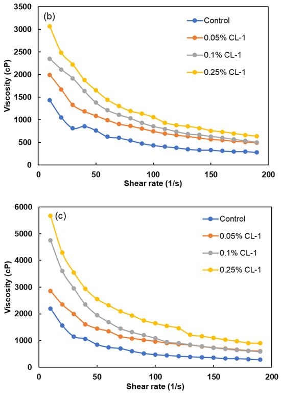 Consequently, the coal particles begin to directly interact with each other in the absence of sufficient water molecules due to reduced water availability. This shift results in coal–coal shearing taking precedence over coal–water shearing, leading to the manifestation of apparent viscosity [53]. The overcrowding of particles prompts the formation of a compact and robust structure within the slurry, making it resistant to disruption. Furthermore, at higher shear rates, the CWS continues to display shear-thinning behavior [54]. The apparent viscosity of CWS was determined by varying the shear rate of CWS in the presence of 0–0.25 wt.% CL-1. Figure 7a–c represent these effects on the apparent viscosities after 10 min, 25 min, and 40 min, respectively. It can be observed that by increasing the shear rate at each time point, the apparent viscosity of CWS rapidly dropped, demonstrating shear thinning behavior (Figure 7a–c). The figures also show that the apparent viscosity increased as the storage time extended. The changes in viscosities over time can be attributed to the interaction between water and coal, resulting in the filling of its pores and reducing the amount of available water between particles [50]. Consequently, this impedes the movement of particles and leads to an elevation in viscosity [55]. It can also be observed that apparent viscosity exhibits an increasing trend with more addition of dispersants after 10 min, 25 min, and 40 min, consecutively (Figure 7a–c). This can be explained by dispersant–dispersant and/or dispersant–water interactions due to the free-floating dispersant molecules [56].