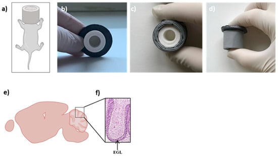 Schematic representation of the experimental setup (a), custom-built 3D printed PLA protective device for in vivo test mounted on a 3 mm thick solid lead sheet (b); PLA device wrapped up in 12 shielding sheets of PCL/W (c); PLA device wrapped up in 24 shielding sheets of PCL/W (d); schematic representation of a section of a cerebellum at 2 days of age (e); antero-dorsal cardinal lobe of the cerebellum (f). The dashed black line externally outlines the EGL. Figure in (a,e) was obtained by Biorender.