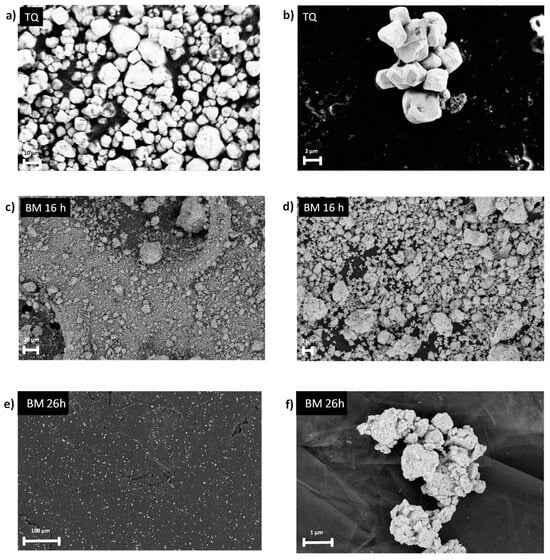 The SEM image of the commercial W powder is as follows: before (a,b), after 16 h (c,d) and 26 h (e,f) of ball milling.
