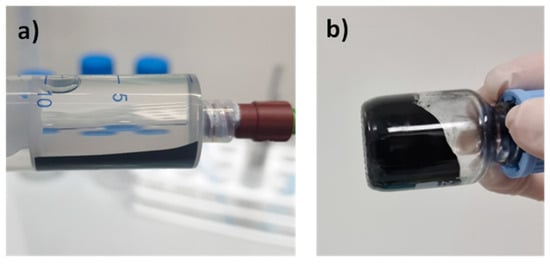It is worth noting that the particle size of the powder plays a key role in the physical stability of the polymer/W suspension. Therefore, the control of W particle size is essential in achieving a homogeneous, stable, and processable suspension. The selected commercial W powder, with a maximum particle size of 10 µm (Figure 2a,b), was unsuitable for preparing stable suspensions. In fact, W particles remained in suspension with the polymer only with the aid of magnetic stirring, while they settled in a few minutes after stopping the external agitation (Figure 3). In this case, the suspension is not suitable to be processed by electrospinning, requiring continuous stirring in situ to avoid powder settling.
