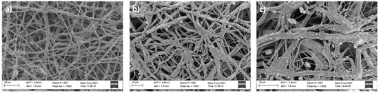 Microfibrous PCL/W sheets characterized as 10 w% (a), 40 w% (b), and 60 w% (c) of W with respect to the PCL polymer.