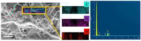The morphology of the PCL/W sheets was investigated using SEM. Some representative micrographs of the obtained sheets are reported as an example in Figure 5. SEM images show that the electrospun samples are basically composed of a dense net of randomly oriented fibers. In addition, SEM analysis revealed the presence of the W particles in the PCL micro-fibrous network. It is evident from the images in Figure 5 how the amount of W particles/aggregates increases with increasing the filler percentage, thus confirming the visual appearance of the samples. EDS analysis at high resolution also confirmed the presence of W in the sheets (Figure 6).