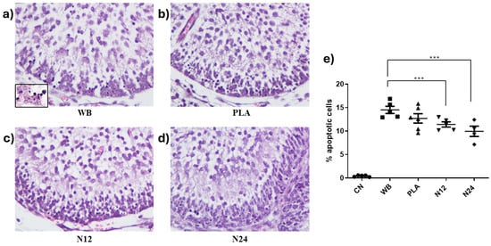 The apoptotic rate in EGL of irradiated mice under different experimental conditions. (a–d) Representative images of the EGL in the antero-dorsal cardinal lobe region of the cerebellum at postnatal day 2 (P2); Hematoxylin & Eosin staining; 40× magnification. The inset in (a) shows pyknotic nuclei at higher magnification (100×) indicative of apoptosis in WB irradiated mice; (e) a graphical representation of the percentage of apoptotic cells in the different experimental groups. *** p < 0.0001.