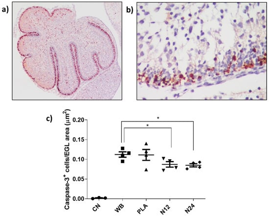 (a) Cerebellum at P2 labeled with activated caspase 3; the EGL, where the cells undergoing apoptosis reside, is colored red (2× magnification). (b) Detail of the EGL at higher magnification (40×). (c) Graphical representation of the quantification of the signal related to the antero-dorsal cardinal lobe region. * p < 0.05.