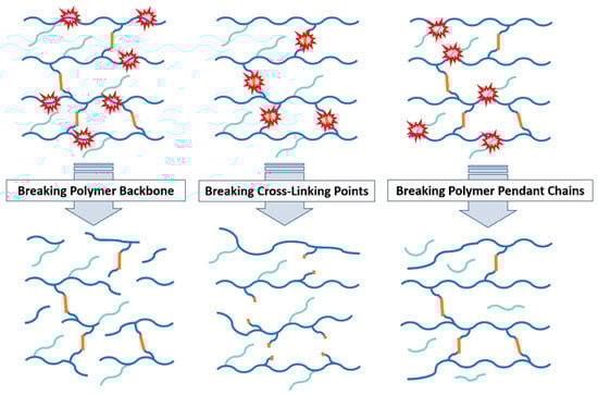 Another viewpoint to analyze hydrogel degradation is looking at the bond cleavage points of the gel network. For a crosslinked hydrogel structure, there are three possible breaking sites: the main polymer backbone, the crosslinking points, or the pendant polymer chains (Figure 1).
