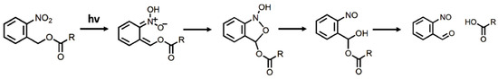 Nowadays, there is rising interest in evolving approaches that allow external temporal and spatial control over the cleavage of crosslinks. Such control is possible by photodegradation by incorporating light-sensitive groups within polymer networks. Photolabile moieties are commonly integrated into the material design as linkers or pendant groups for modulating the structure, surface, mechanical properties, or matrix degradation. Nitrobenzyl (NB)-based linkers are some of the most commonly used photodegradable linkers. Their popularity can be attributed to their responsiveness to cytocompatible doses of light and the observed in vitro and in vivo biocompatibility of their cleavage products [30]. Under UV irradiation, an NB-photo labile bond is excited, resulting in intramolecular hydrogen abstraction followed by intramolecular rearrangement to produce a cyclic intermediate. The subsequent ring opening of the cyclic intermediate results in the formation of an o-nitrosobenzaldehyde and a carboxylic acid (Figure 2) [31]. The photolytic degradation rate of the hydrogel, as well as the synergy with other degradation methods, such as hydrolysis, are heavily influenced by the labile bond adjacent to the NB linker (different results for esters, amides, carbonates, and carbamates) [30].