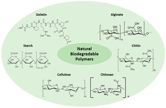 As is described above, hydrogels formed from biodegradable polymers derived from natural sources are now replacing non-biodegradable hydrogels in many applications [39]. Accordingly, crosslinked natural polymers have been widely studied in recent years for their use in biodegradable hydrogels. It is believed that these naturally derived hydrogels have an advantage over other biomaterials in terms of degradation, due to their inherent biodegradability, and the reduced toxicity of their degradation byproducts [40]. Polysaccharides, such as starch, cellulose, chitosan, alginate, and polypeptides like gelatin, are the most common natural biodegradable polymers used as biodegradable hydrogels (Figure 4).