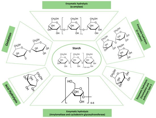Starch is a natural polysaccharide that is produced by plants and especially by crops (potatoes, corn, and rice) [41] in the form of granule. It is composed of a linear α-amylose structure (20–30%) and a branched amylopectin structure (70–80%) [42], linked through α-d-(1→4) and α-d-(1→6) glycosidic bonds [41]. Amylopectin is by far the most predominant polysaccharide type, and it primarily defines the properties of the starch. Starch is a versatile biomaterial due to its inherent biodegradability, abundance, cheapness, and non-toxic properties [41]. These materials are commonly used in food packaging [41], controlled release of fertilizers, water treatment, and the design of new drugs [42]. Therefore, the knowledge about its degradation is crucial to achieve controlled release or minimize the time required for the plastic to degrade in the environment [43]. There are several mechanisms by which starch degradation is initiated (see Figure 5), such as acid or enzymatic hydrolysis or oxidation [44]. Biologically, there are a variety of different enzymes involved in starch degradation. Four groups can be distinguished: (i) endoamylases (α-amylase), which are able to cleave α-(1→4) glycosidic bonds to form different oligosaccharides; (ii) exoamylases (β-amylase) that cleave both α-(1→4) and α-(1→6) glycosidic bonds to produce glucose or maltose; (iii) debranching enzymes (isoamylase and pullanase type I) that exclusively hydrolyze α-(1→6) glycosidic bonds; and (iv) transferases (amylomaltase and cyclodextrin glycosyltransferase), which cleave the α-(1→4) glycosidic bond to create a new glycosidic bond [45]. Conversely, starch is also cleaved by acid hydrolysis, but not by alkali hydrolysis, due to the stability of glycosidic bonds at a high pH. This process occurs in two phases: an initial rapid phase where the amorphous regions of starch are hydrolyzed, followed by a slower phase where both amorphous and crystalline regions are cleaved [46] resulting in a partial degradation of starch granules [47]. Additionally, starch undergoes degradation when exposed to oxidizing agents, such as periodate, dichromate, permanganate, persulfate, chlorite, and hydrogen peroxide, leading to depolymerization. This process results in lower viscosity dispersion, retardation in recrystallization due to the incorporation of carbonyl and carboxyl groups, and increase in the stability and transparency [48].