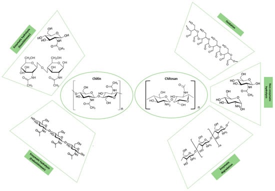 Schematic illustration of the degradation products of chitin and chitosan according to the corresponding degradation mechanisms.