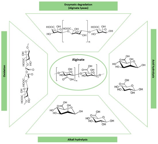 The monovalent form of alginic acid [71], alginate, is a hydrophilic [72] and linear polysaccharide composed of β-(1→4)-linked D-mannuronic acid and α-(1→4)-linked L-guluronic acid homopolymeric blocks. This well-known biomaterial is obtained from brown algae and depending on the algae source, blocks are randomly arranged or alternating [73]. Alginate is widely used for the controlled release of drugs and agrochemicals [74], water treatment, food industry, packaging, catalysts [75], and tissue engineering, due to its low toxicity, biocompatibility, and simple physical gelation in the presence of divalent cations such as Ca2+, Mg2+, Ba2+, and Sr2+ [76]. The alginate polymer is degraded by several mechanisms, including enzymatic biodegradation by alginate lyases, chemical hydrolysis (acid or alkali), and oxidation (see Figure 8). Alginate lyases, which can be isolated from various organisms, including algae, marine mollusks and some bacteria, viruses, and fungi, depolymerize alginate by the β-elimination of glycosidic bonds generating unsaturated oligosaccharides with C=C at the non-reducing end [77]. Alginate is also susceptible to hydrolysis in an acidic or alkaline medium, especially at elevated temperatures [78]. Above pH = 10.0, sodium alginate is degraded by the β-elimination mechanism [79], while at a low pH, alginic acid is formed due to acid catalyzed hydrolysis of glycosidic linkages [80]. Another attractive mechanism to degrade alginate includes partial oxidation, where sodium periodate oxidized alginate generating aldehyde groups in the structure. This mechanism does not interfere with its gel-forming capability, but depending on the degree of oxidation, molecular weight, pH, and temperature, the degradation rate may change [76].