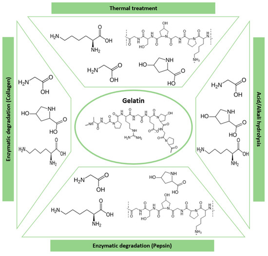 Gelatin is a natural, soluble, functional protein compound derived from the hydrolysis of collagen, a fibrous protein found in bones, cartilages, tendons, and skin [52]. The chemical structure of gelatin consists of repetitive sequences of Gly-X-Y, where X is often proline (Pro) and Y is hydroxyproline (Hyp) [81]. Gelatin is a water-soluble, biodegradable, low-immunogenic, biocompatible, and easy to obtain polymer [50]. Consequently, it has been widely explored for the food industry, for example, to provide texture, foam, and clarity, as well as to stabilize food structure, for cosmetics and health products, pharmaceuticals, and for biomedical applications, including coatings, the preparation of biodegradable hydrogels [82], matrices for three-dimensional cell culture, and components of tissue engineering scaffolds [83]. Additionally, gelatin exhibits exceptional gel-forming capabilities in response to temperature changes [84]. However, the weakness and susceptibility to degradation in water of its hydrogels limits their applicability [50]. Gelatin degradation results in the loss of its gelling properties, and it can occur when exposed to heat, extreme pH conditions, enzymatic activity, etc. (see Figure 9). At low temperatures, chain mobility is reduced and inter/intrapolymeric hydrogen bonding is more stable, but when exposed to high temperatures, gelatin is denatured and, therefore, is more accessible for solvents and more susceptible to degradation via hydrolysis [85]. Regarding the pH, under acidic conditions, crosslinks between chains are primarily broken while peptide bonds are less frequently attacked. In contrast, at higher pH conditions, the more numerous peptide bonds are prone to breaking. On the other hand, in terms of enzymatic degradation, proteolytic enzymes, such as pepsin and pancreatin, are the main responsible enzymes. Pepsin is typically utilized in media with a pH below 6.8, while pancreatin is used for media with a pH of 6.8 or higher [86]. Furthermore, research related to gelatin degradation also mentions the use of collagenases. These enzymes are effective for degrading both gelatin and collagen and provide an additional option for the manipulation of gelatin-based biomaterials [87].