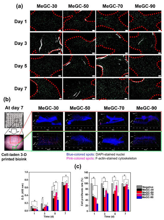 (a) Two-dimensional and (b) 3D live/dead fluorescence images of 3D-printed cells in MeGC-30, MeGC-50, MeGC-70, and MeGC-90 for 7 days of culture. Scale bars in (a) represent 200 μm. (c) Optical density and cell proliferation rate of printed MG-63 cells for 1, 3, 5, and 7 days (* p < 0.05). Reprinted permission from [108], Copyright (2022) Elsevier.