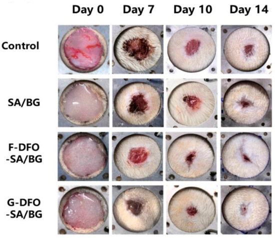 In vivo assessment of hydrogels for wound healing. Representative images of wounds treated with nothing (control), SA/BG hydrogel (SA/BG), physically encapsulated DFO-SA/BG hydrogel (F-DFO-SA/BG), and chemically grafted DFO-SA/BG hydrogel (G-DFO-SA/BG). Copyright © 2021. Zhang et al. [113].