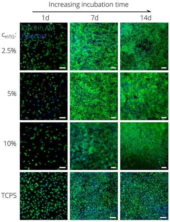Proliferation study of ATDC-5 cells on ADA-GEL. Calcein AM/Hoechst stained ATDC-5 cells cultured on ADA-GEL crosslinked with 2.5%, 5%, and 10% (w/v) mTG for 1, 7, and 14 days (n = 3); scale bars = 100 μm. Adapted with permission from [122]. Copyright 2020, American Chemical Society.