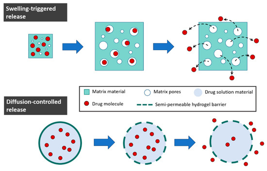 The mechanism by which the drug is released varies depending on the properties of the hydrogel matrix and the drug concentration. The main release routes are diffusion, swelling, and degradation of the carrier. In diffusion-controlled systems, whether the drug-loaded core is covered by a hydrogel film or the drug is uniformly distributed throughout the hydrogel matrix, the drug molecules are non-covalently entrapped in the material. In this case, the release of the drug is related to the pore size, tortuosity, and steric hinderance of the hydrogel network. Diffusivity is a function of drug concentration and, at the same time, drug diffusion from hydrogel matrix is also influenced by the degree of swelling and crosslinking density of the matrix. In a similar manner, swelling-triggered release is caused by a change in the pore size due to a volume expansion of the material (Figure 13). In these two cases, the release of the cargo is not necessarily tied to the degradation of the material and, even though swelling and diffusion can play a role in the degradation process, the liberation of the drug can still occur before degradation starts. In some cases, the swelling of the hydrogel is triggered by some external stimuli, such as pH or temperature changes.