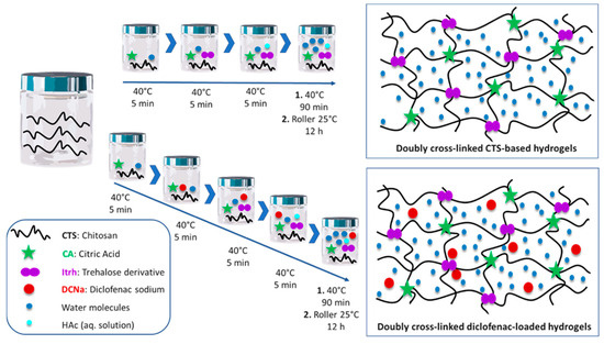 Schematic representation of the double crosslinked chitosan-based hydrogel for enhanced rheological properties and controlled release of sodium diclofenac. Citric acid acts as the ionic crosslinker and the trehalose derivative as the covalent crosslinker. Copyright © The Royal Society of Chemistry 2020, reproduced with permission from Iglesias et al. [136].