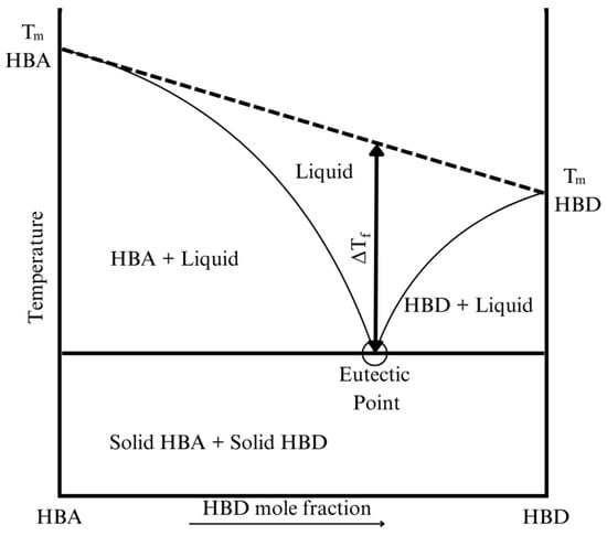 Regarding the melting point of DESs, the depression of this temperature is controlled by thermodynamic parameters, such as the lattice energy of the mixture, and the entropy changes through the process of forming a liquid phase [78,79]. A wide range of liquid state is critical for a DESs, since it reduces the sensitivity of the additive to temperature changes, which may provoke its solidification. The typical behavior of these eutectic mixtures is represented by the example shown in Figure 1.