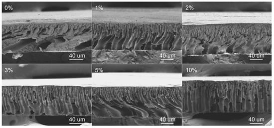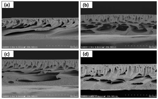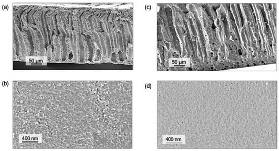 | [128] | PES (NMP) | [N4444][Cl]/IM (3:7) | Tetrabutylammonium chloride | Imidazole | Hydrophilic | 2 | NIPS (H2O) | 40.5 ± 1.2 | 86.5 ± 2.5 | All: Dense top layer and a porous sublayer with a finger-like and macrovoid structure | |