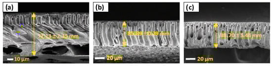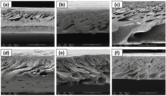| [97] | PVDF (DES + PolarClean/TEP) | PTSA/TBnA MsO (1:1) | Benzyl-trimethylammonium mesylate | p-toluensulphonic acid | Hydrophilic | 60 | NIPS (H2O/IPA) | 80–150 | 82–85 | 104–110 | Sponge- and finger-like with macrovoids |