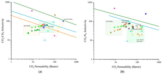 - Lian, S.; Zhao, Q.; Zhang, Z.; Li, R.; Song, C. Tailored Interfacial Microenvironment of Mixed Matrix Membranes Based on Deep Eutectic Solvents for Efficient CO2 Separation. Sep. Purif. Technol. 2023, 307, 122753. [Google Scholar] [CrossRef]