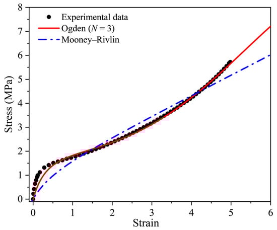 The Mooney–Rivlin model and Ogden model of order N = 3 were used to fit the experimental stress-strain data of the unaged rubber, as shown in Figure 4. It can be seen that there is significant deviation between the fitting result of the Mooney–Rivlin model and the tensile test data, and the model cannot fit the “S-shape” characteristics of the stress-strain curve under large deformation, which has been found in many previous studies [5,29]. In Figure 4, we can see that although the Ogden model of order N = 3 can reflect the main characteristics of the tensile behavior in a large deformation, there is still an obvious deviation between the fitting curve and test data in the small deformation range. The Ogden model is successful in capturing the nonlinear hyperelastic behavior of many kinds of rubbers, so why does it not fit the data in Figure 4 well? This may be due to the fact that the stress increases rapidly as strain increases at a low strain range, and the stress-strain curve shows a more prominent nonlinear characteristic.