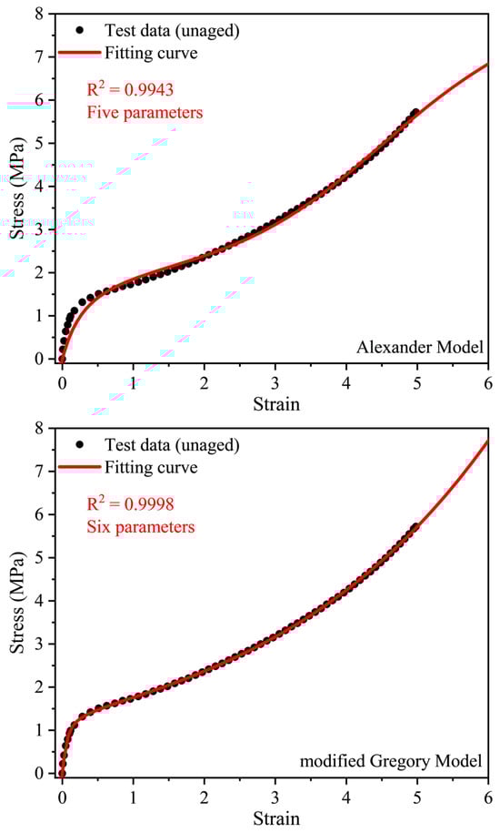 To check the applicability of the six top models, we fitted them to the test data in Figure 4, and the results are shown in Figure 5. It can be seen that the Davis–De–Thomas model, modified Gregory model and Gregory model can perfectly model the stress-strain data of the unaged EPDM, while the modified Yeoh model, Alexander model and Gen-Yeoh model do not. From Figure 5, we also can conclude that although the six models are successful in reproducing the stress-strain curve with strong nonlinear characteristics in the 100% strain range, when the strain is large those models are not all suitable. Models with fewer parameters and considerable modeling ability are considered to be the best models. Thus, the Davis–De–Thomas model with four parameters was selected as the constitutive model of the EPDM rubber.