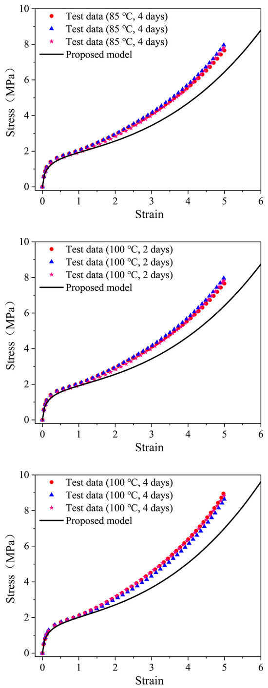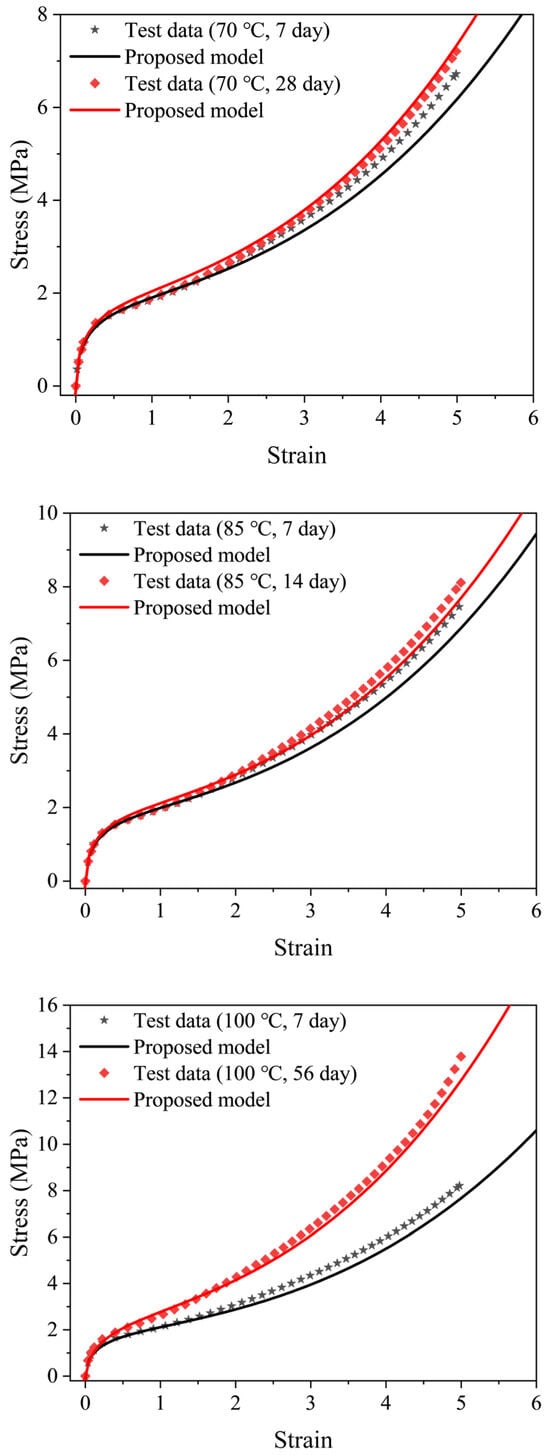 A thermal aging model of EPDM was developed by correlating the parameters in the Davis–De–Thomas model with aging temperature and aging time. In order to verify the validity of this model, the stress-strain data of samples aged at 70 °C for 7 and 28 days, 85 °C for 7 and 14 days and 100 °C for 7 and 56 days were used. Figure 7 shows the comparison of experimental and prediction curves, and the results show that the model can reproduce the aged stress-strain data at the three aging times of 14, 28 and 56 days, while the model fitting results obviously deviate from the test data of the samples aged for 7 days.