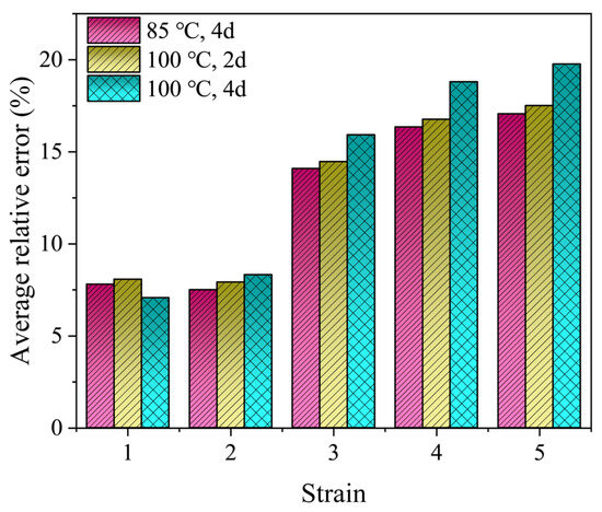 To further check the predictive ability of the thermal aging model, independent data should be used. Tensile stress-strain data for EPDM rubber aged at 85 °C for 4 days and 100 °C for 2 and 4 days were obtained by conducting new experiments on the EPDM rubber according to the methods in the Experiment Setup Section. The test data compared to the predicted results of the thermal-aging model are shown in Figure 8. It can be found that the model prediction results are in agreement with the actual stress-strain data in the moderate strain range of 200%. As the strain increases, the response for the EPDM predicted by the proposed model underestimates the experimental observations. Figure 9 shows the average prediction errors of the proposed model at a constant strain of 100%, 200%, 300%, 300%, 400% and 500%, which is defined as (test data-model prediction)/test data × 100%. In the moderate strain range of 200%, the errors remain below 10%. Furthermore, the maximum errors of the prediction results at 85 °C for 4 days and 100 °C for 2 and 4 days were computed to be 17.06%, 17.51% and 19.77%, respectively.