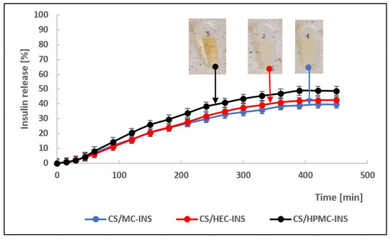 The resulting release profiles were compared using the statistical methods recommended by the FDA and EMA (Table 3) [41]. The CS/HEC-INS and CS/MC-INS release profiles were found to be similar (factor f1 < 15; factor f2 > 50).