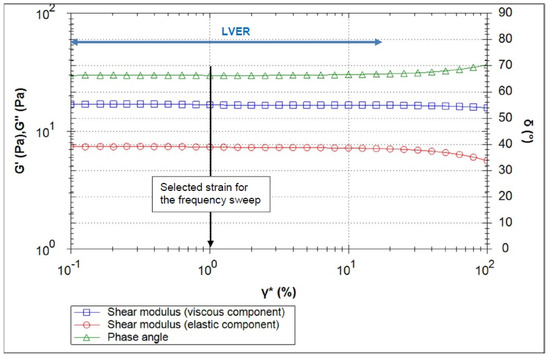 Figure 3, Figure 4, Figure 5, Figure 6 and Figure 7 show the results of the oscillatory measurements. Figure 3 shows the amplitude sweep carried out on the material CS/HEC + INS at 25 °C as an example. As long as the elastic shear modulus G′ is constant, the material is in the linear–viscoelastic range where the applied deformation does not lead to any breakdown of the sample´s structure. For the frequency sweeps, a deformation of 1% was selected.