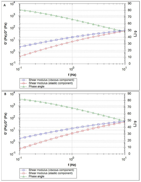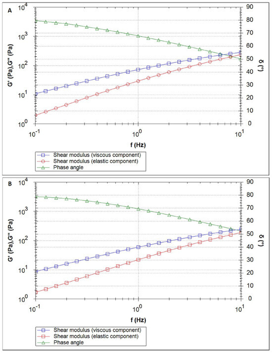 Formulations with a higher viscous shear modulus than the elastic shear modulus show “liquid-like” behavior, where the elastic and viscous modulus increase with increasing oscillation frequency. The tanδ > 1 relationship observed in the study (tanδ = G″/G′ [57]), was also noted by other authors [57,58,59,60,61], who analyzed the effect of chitosan concentration and solvent used on the rheological and viscoelastic properties of the samples they obtained. The systems obtained showed characteristics of diluted solutions (G″ > G′) and behaved as viscoelastic liquids. It has been suggested that this may be related to the neutralization process (strong chitosan–solvent interactions form in acidic media) and the intramolecular electrostatic and steric repulsion effects exerted by the anionic residues [58]. Analyzing the viscous and elastic moduli in Figure 4, Figure 5 and Figure 6, it would be expected that an intersection of G″ and G′ will occur at a high frequency. Steffe et al. [62] suggested that polymeric materials tend to adopt a more solid form at higher frequencies.
