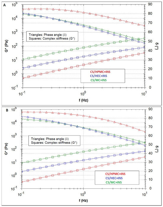 The complex stiffness G* and the phase angle of the materials are compared in Figure 7A (25 °C) and Figure 7B (32 °C). For all samples, the temperature increase led to a decrease in the complex stiffness. All materials differed in their complex stiffness. For both temperatures, CS/HPMC + INS had the lowest stiffness and CS/MC + INS had the highest. The curves run parallel to each other: the lower the frequency, the lower the stiffness. In practice, this means that the slower the movement to spread the product, the “more liquid” the material feels. For both temperatures, the phase angle curves of CS/HEC + INS and CS/MC + INS were very similar, but lower than for CS/HPMC + INS, meaning a higher domination of the “liquid-like” properties for this last material.