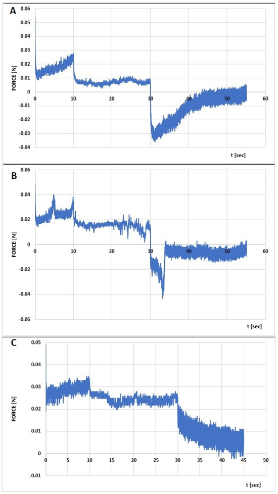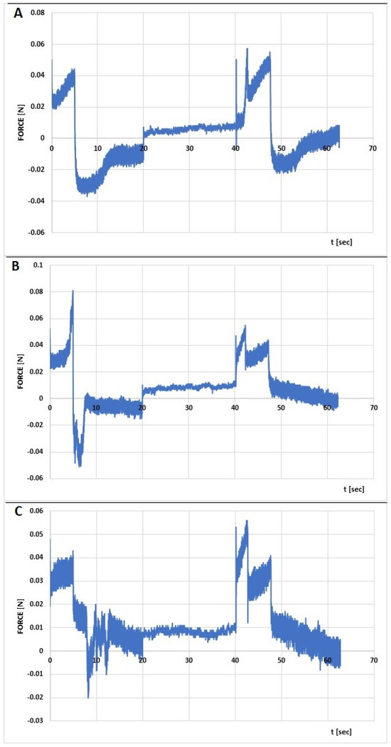 Penetration test (compression/relaxation/tension, CRT) of chitosan/methylcellulose (CS/MC) with insulin (A), chitosan/hydroxyethylcellulose (CS/HEC) with insulin (B), chitosan/hydroxypropylmethylethylcellulose (CS/HPMC) with insulin (C).