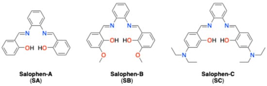 - Erxleben, A. Transition metal salen complexes in bioinorganic and medicinal chemistry. Inorg. Chim. Acta 2018, 472, 40. [Google Scholar] [CrossRef]