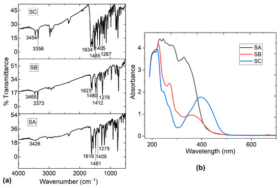 (a) FT-IR spectrum of salophen compounds and (b) UV-Vis spectrum for SA, SB, and SC in chloroform.