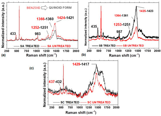 The thus characterized salophen compounds were embedded in the PEDOT:PSS matrix by means of spin coating, and the deposited composite films were treated with IPA to obtain the quinoid form of PEDOT. Raman spectroscopy is a valuable tool for studying composite films within a PEDOT matrix. Figure 4 shows the Raman spectra of the (a) PEDOT:PSS-SA, (b) PEDOT:PSS-SB, and (c) PEDOT:PSS-SC composite films. In the Raman spectra, it is observed that all samples present the main bands of the PEDOT film. The bands around 434 ± 3, 984 ± 3, and 1250 ± 4 cm⁻¹ are attributed, respectively, to C-O-C deformation, oxyethylene ring deformation, and Cα-Cα inter-ring stretching [43,44]. The band at 1364 ± 6 cm⁻¹ is attributed to the Cβ-Cβ stretching mode [45,46], and the intense band at 1423 ± 6 cm⁻¹ corresponds to the Cα=Cβ symmetrical stretching vibrations in the PEDOT five-membered thiophene ring, which can provide information related to structural changes in the PEDOT chains [43,44,45,46,47,48]. It is important to consider that, in the benzoid form of the Cα=Cβ bond, there are two conjugated π-electrons, while, on the Cα=Cβ bond in the quinoid form, there are no conjugated π-electrons [43,44,45,46,47,48]. The symmetrical Cα=Cβ vibration will exhibit a red shift when there is a change from the benzoid to the quinoid form in the chain structure. In the spectrum shown in Figure 4a for the PEDOT SA composite film, a shift in the signal from 1425 to 1423 cm⁻¹ is observed. Similarly, in the PEDOT SB composite film (Figure 4b), a shift from 1424 to 1421 cm⁻¹ is noted, and finally, in the PEDOT SC film (Figure 4c), a red shift from 1429 to 1417 cm⁻¹ is observed. The shift in the Raman signal observed in the spectra of the PEDOT:PSS films is attributed to changes in the polymer structure and interactions due to post-treatment, leading to a reorganization of the PEDOT nanostructure. This reorganization can alter the conformation of PEDOT chains from a benzoid to a more conductive quinoid structure, affecting the vibrational modes detected by Raman spectroscopy [14]. The quinoid form is dominant in the PEDOT composite films, which may result in an increase in conductivity. Changes in the Raman spectra intensities further confirm the interaction between the particles and the polymer chains [49]. Finally, when comparing the spectra of the films treated with IPA, more defined peaks are observed in the PEDOT:PSS-SA and PEDOT:PSS-SB films. The above is an indication of a higher degree of molecular order relative to these PEDOT films.